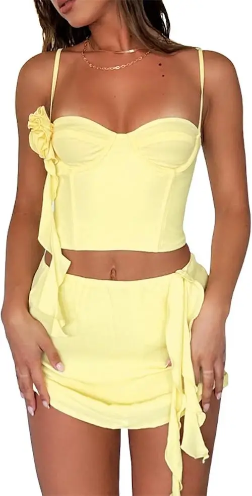 You’re going classic, sexy, super recognizable Sabrina. I love it. Despite the fact that Gov Ball was now several months ago, we all still remember that adorable yellow corset dress (?) with her signature heart cutout. And of course, the short n’ sweet queen had platform cream boots to complete the look and give her a couple extra inches. Check out this affordable dupe yellow set, and if you feel inspired and artsy, cut out a little heart!