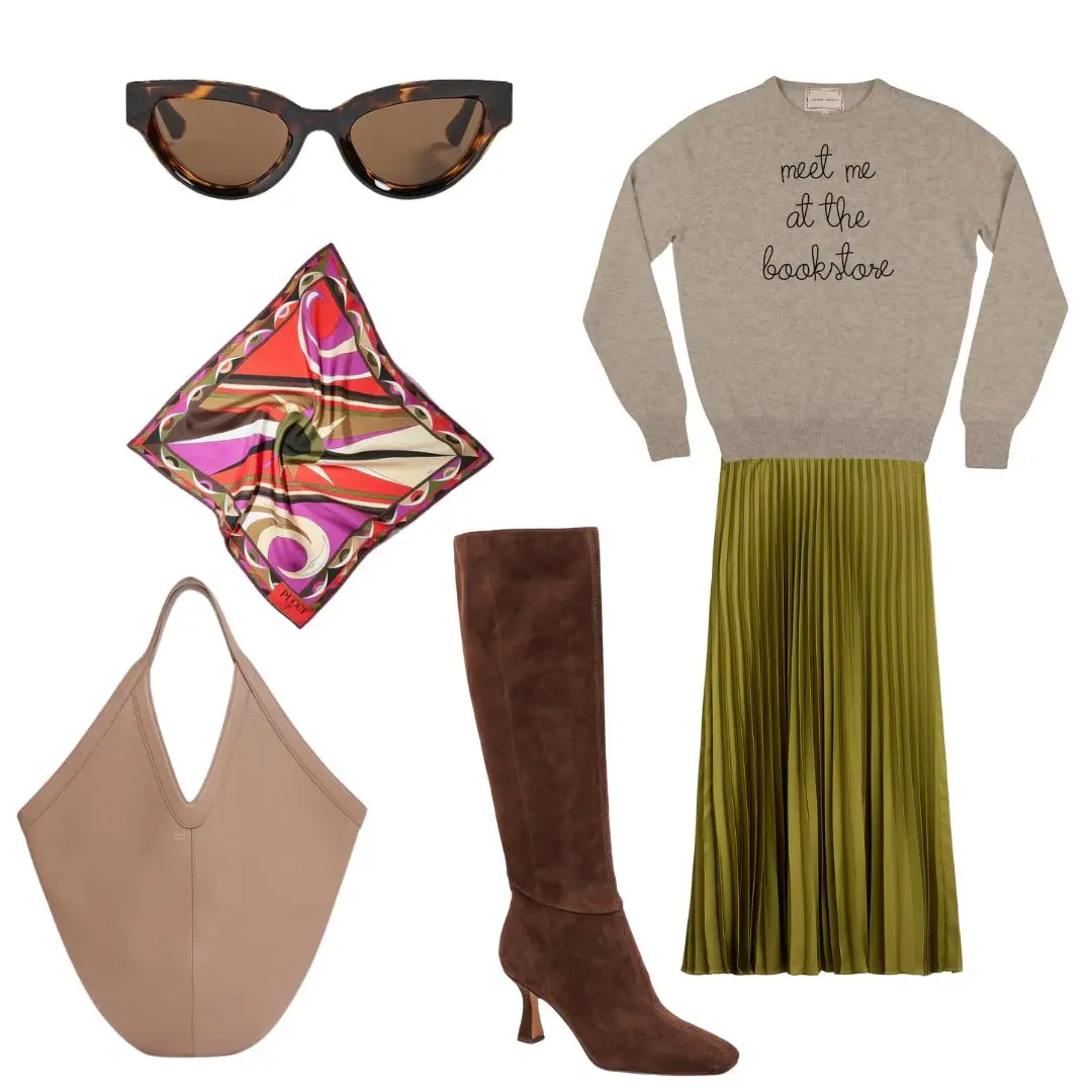 When I saw these Gyra boots in this dark brown suede, I immediately imagined them paired with a sweet midi skirt. The stiletto heel dresses up the casualness of this cashmere sweater perfectly and the silk scarf serves multiple purposes. It can be tied up in your hair on a windy day, wrapped around your neck if the weather dips, or tied on your bag for a pop of color.