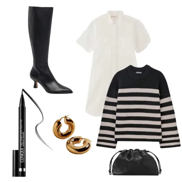 I love the contrast of a black leather boot and a dainty top, which is what makes this look work so well. These Augie boots are both toughened up and chic, and paired with a white button-up shirt dress, they offer a little edge to an otherwise preppy look. Toss a striped sweater over your shoulder for a cute accent that is also functional — you can slip it on when the weather suddenly chills.