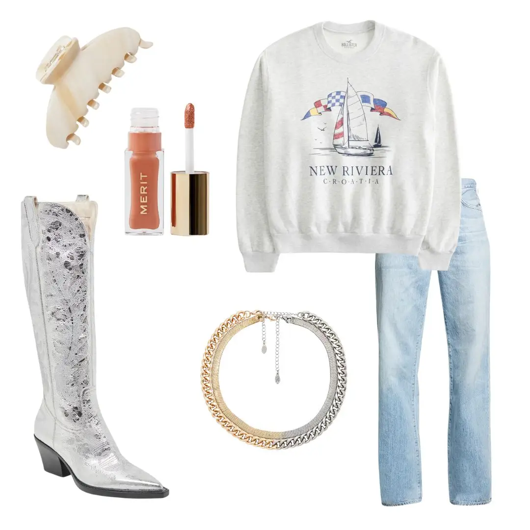 The trick to a statement boot, like these metallic Ryatt beauties, is to keep the rest of your look ultra-chill. Curl into your favorite worn-in sweatshirt and light-washed denim for a look that’s à la Princess Diana. The mixed metal, chunky necklace adds a wink to the silvery boots for a look that just oozes casually cool.