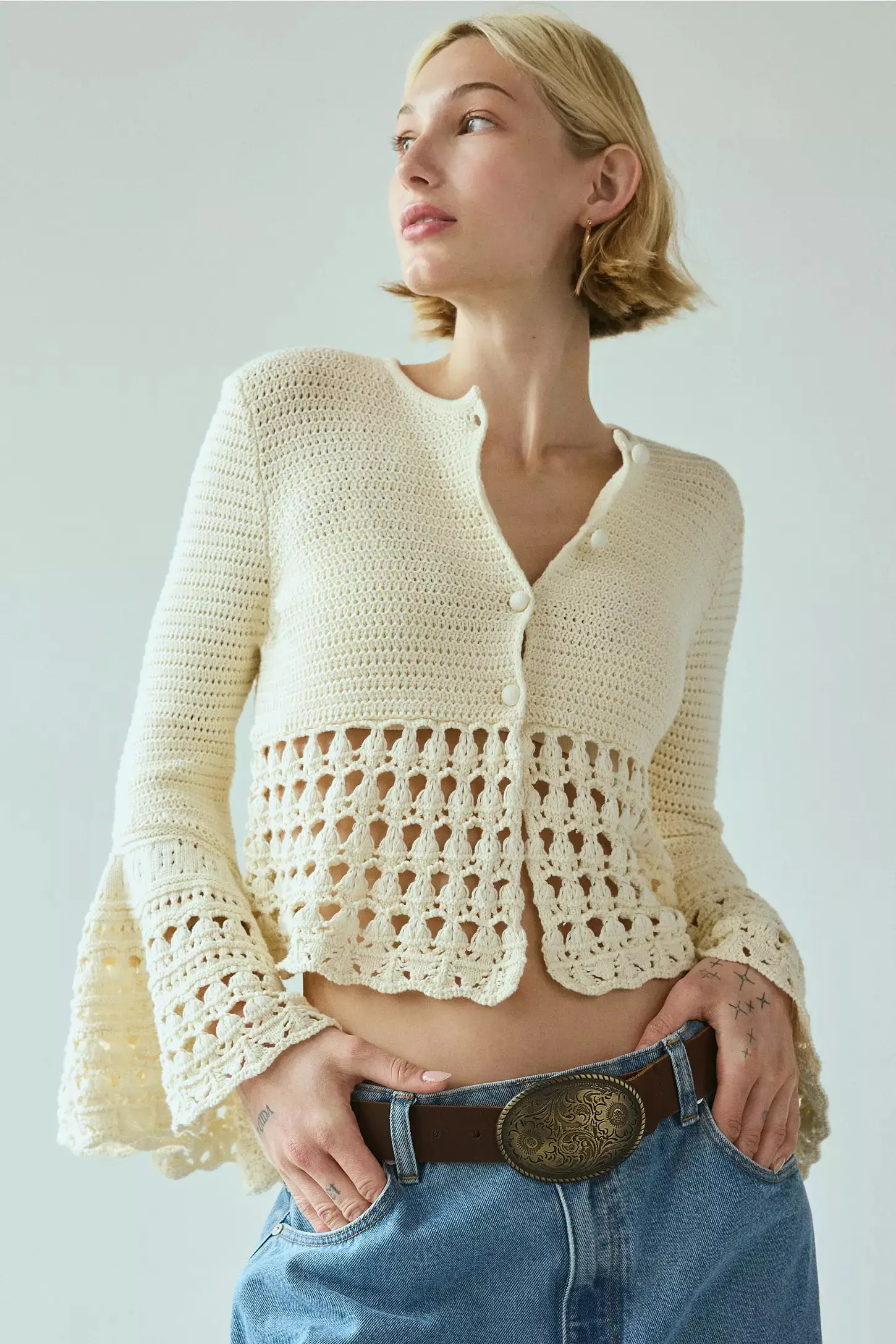 Kimchi Blue Stevie Crochet Bell Sleeve Flyaway Cardigan