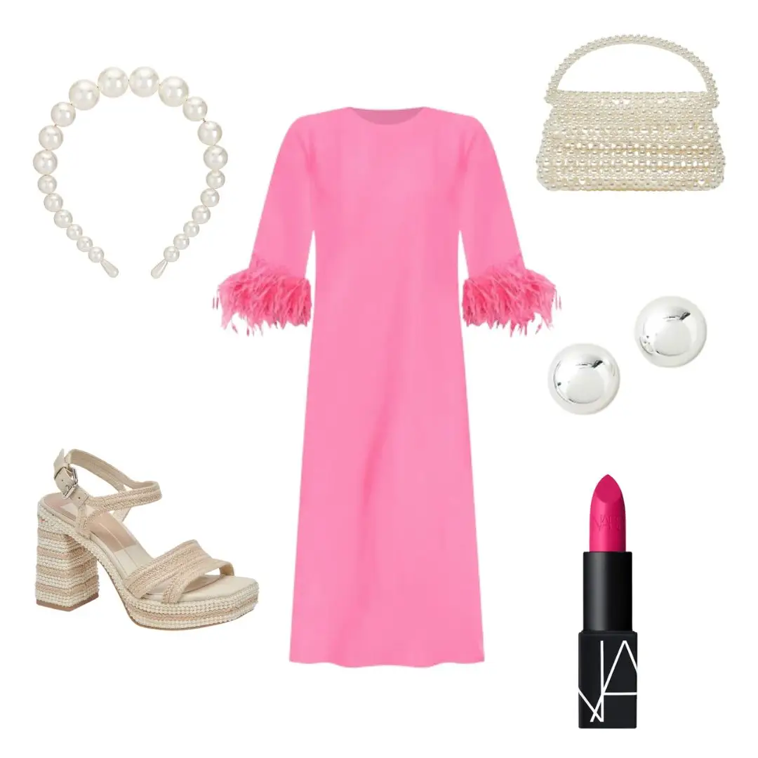 When it comes to pearls, more is more — at least when it comes to Dolce Vita. Both the brand’s Elloise Handbag and Anira Pearl Heels are embellished with both to an incredible degree. Add a pearl headband and these silver ball studs to your feathery pink shift to truly lean into the tea party vibes. The finishing touch? Fluorescent pink lipstick, ofc!
