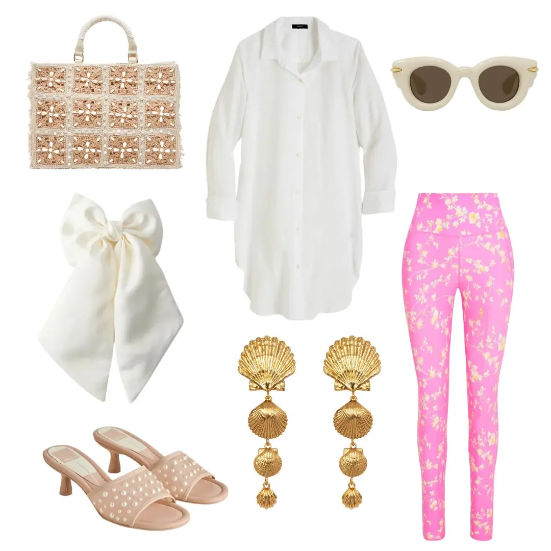 Lately I have been LIVING for kitten-heeled mules paired with leggings, and the second I saw these Mezza Pearl Heels, that’s exactly how I wanted to wear them. Balance out the loud leggings with more simple accents — an oversized button-down, a white bow for the hair, and some gold dangle earrings. This look is perfect for running around town, which is why I’d pair it with Dolce Vita’s Lottie Tote to carry all of my essentials.