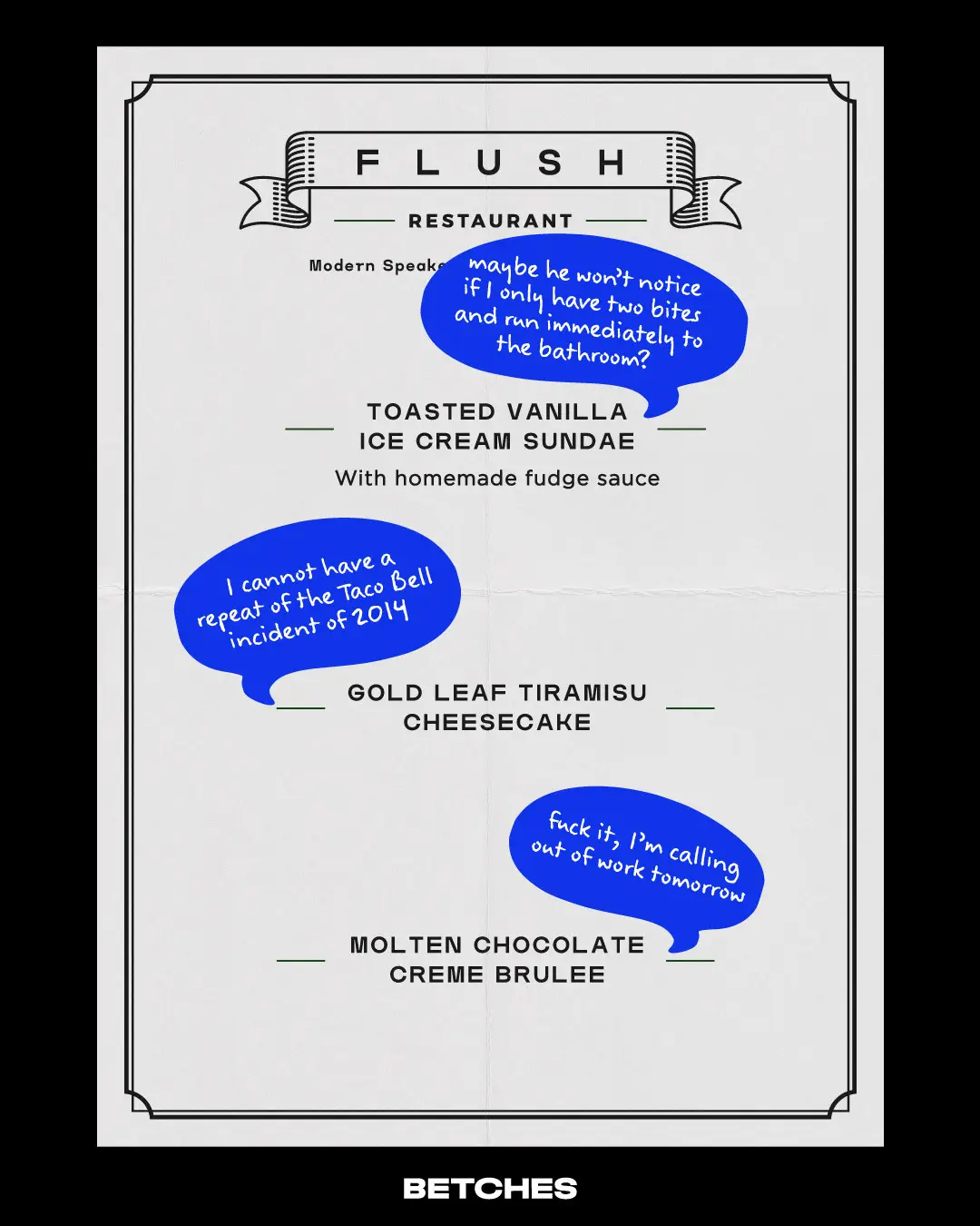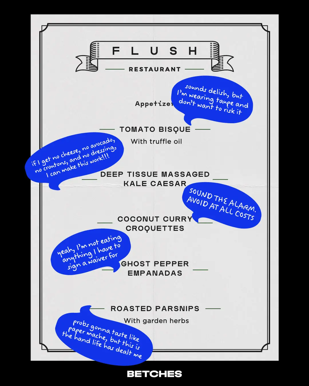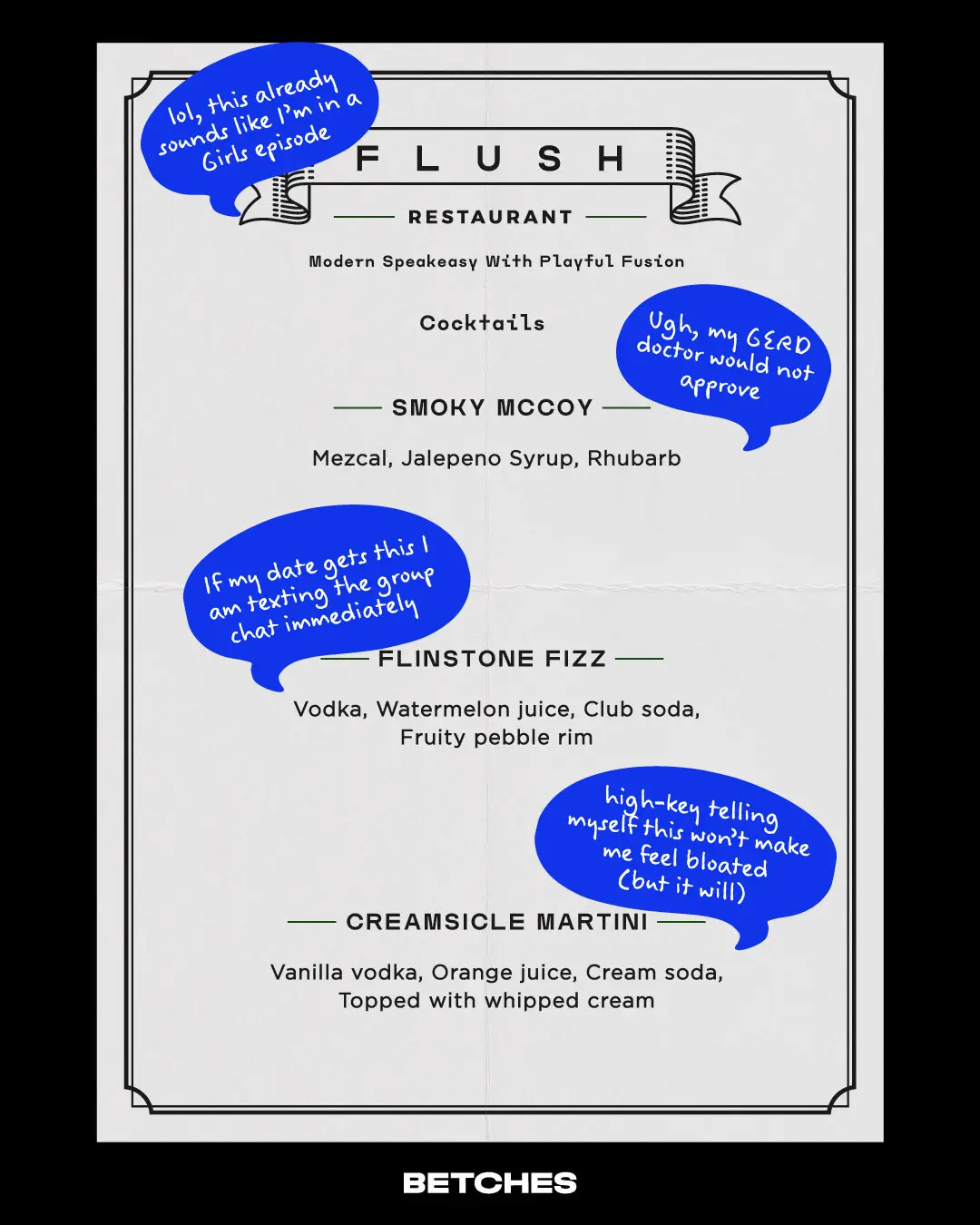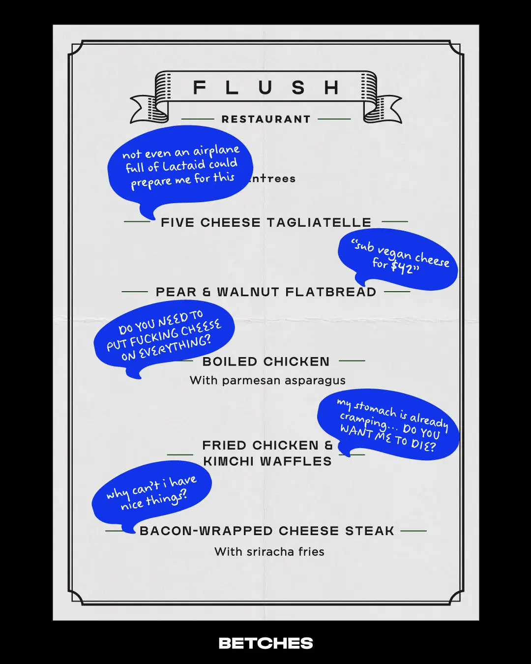 As a cathartic exercise, we’ve marked up a menu to help us empathize with our IBS sisters and the struggles of watching their date chow down on a steak burrito while they have to pretend they’re super excited about their garden salad with no dressing.
