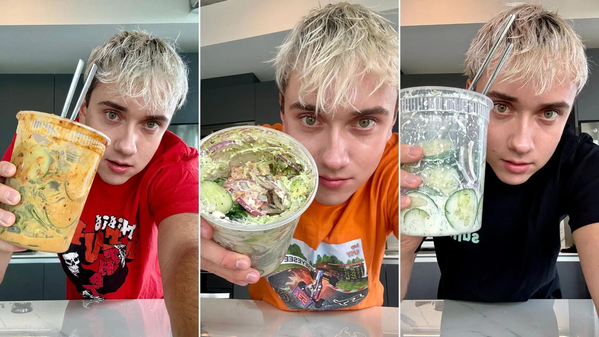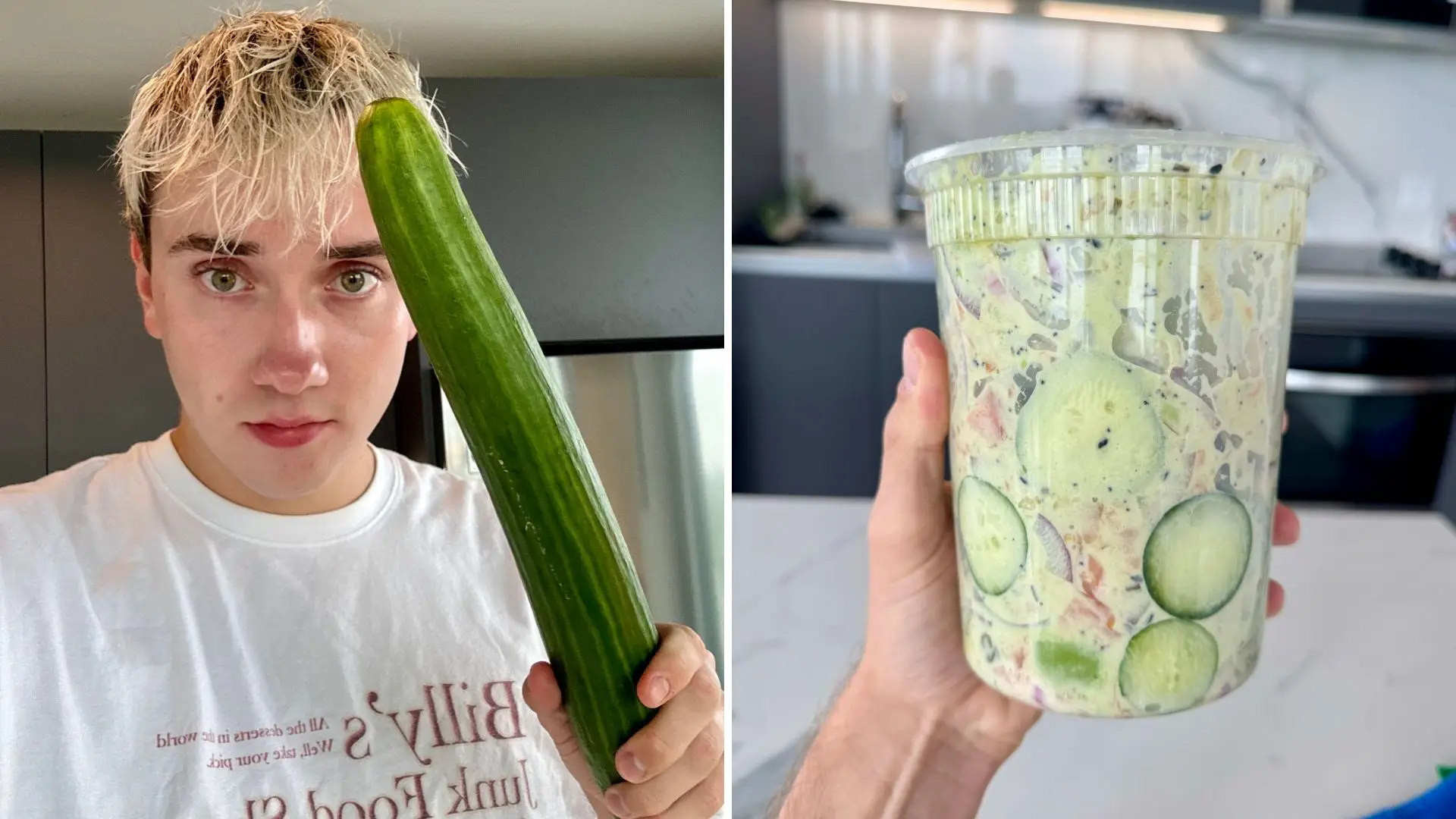 Logan: It started with: you have to eat an entire cucumber in a day. But it’s gotten to the point where I’m eating more than one a day now for the videos. I have so many ideas and there’s so many people requesting new cucumber recipes. So I’m making a lot more than usual now.