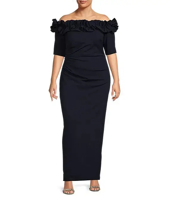 Plus Size Ruffled Off-the-Shoulder Short Sleeve Crepe Sheath Gown