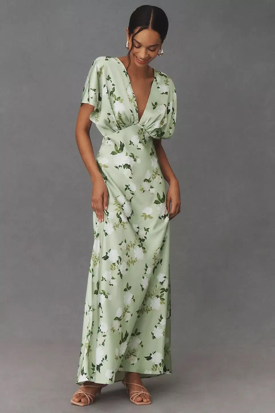 BHLDN Leila Deep-V Flutter-Sleeve Satin A-Line Gown