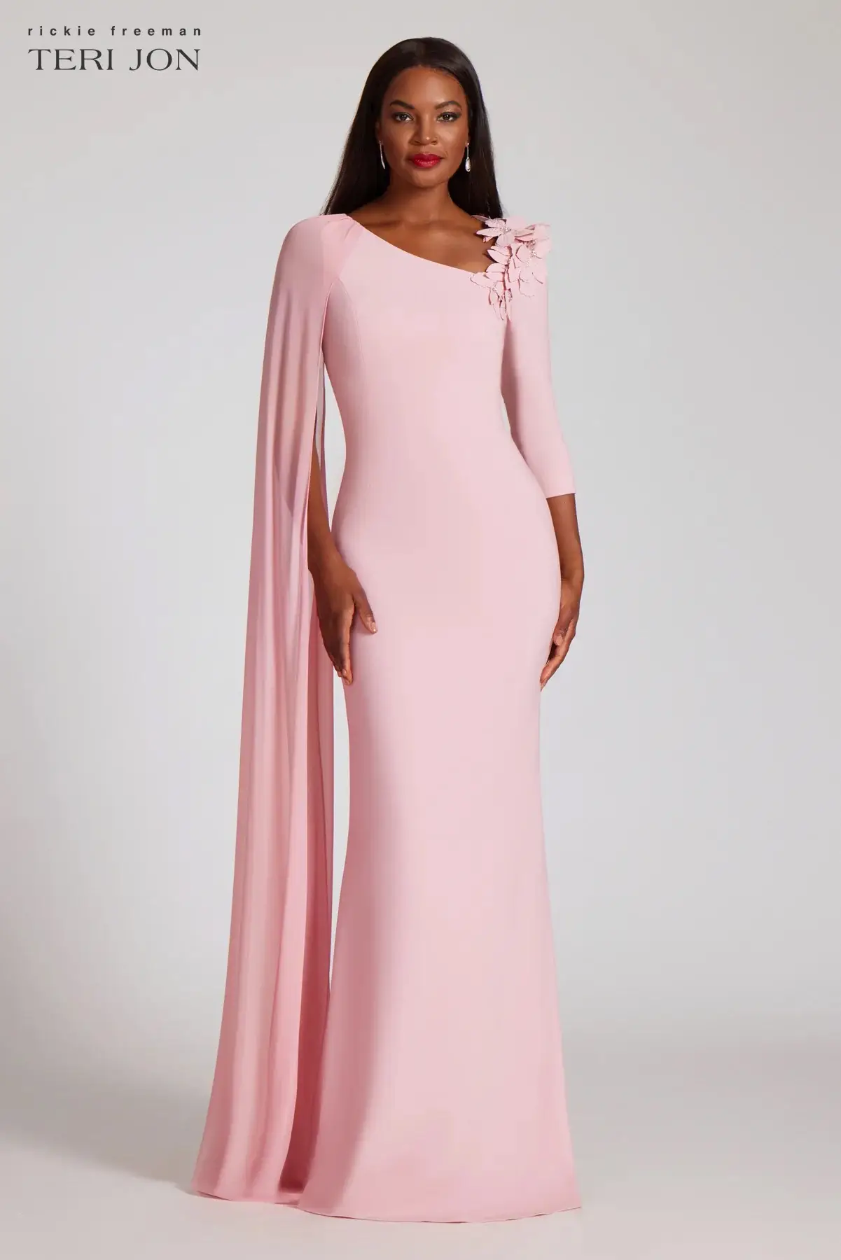 Betsy & Adam Satin Bow One Shoulder Scuba Crepe Sleeveless Mermaid Gown