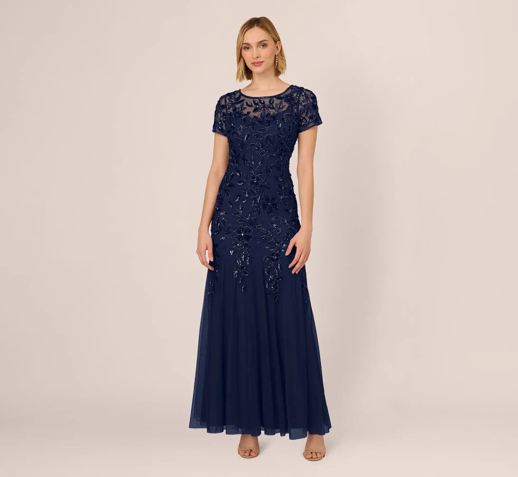 Adrianna Papell Hand Beaded Short Sleeve Floral Godet Gown