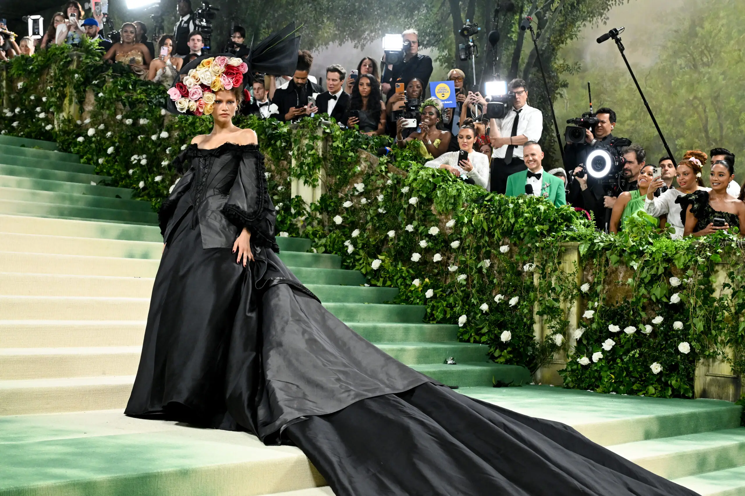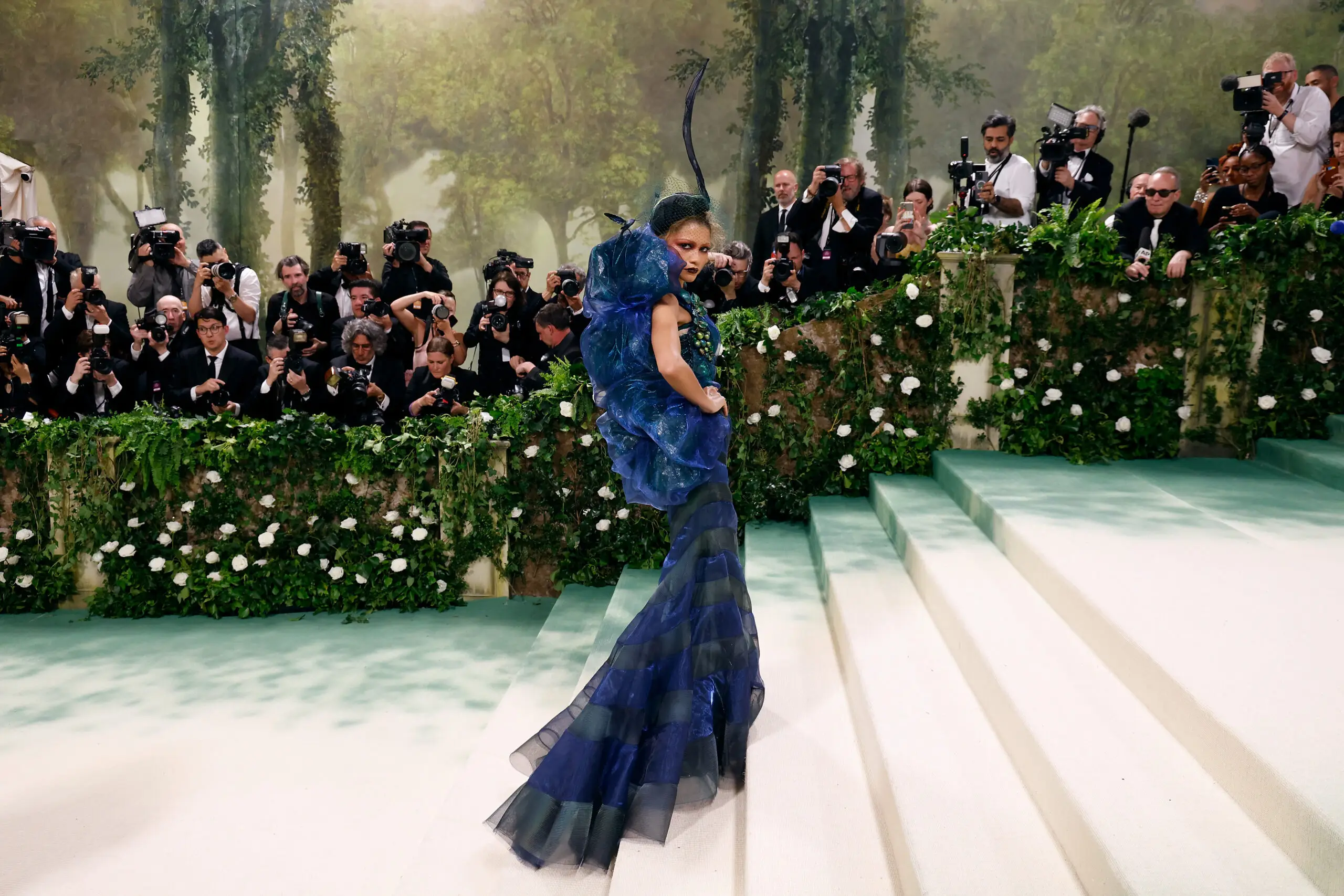 Zendaya, as dressed by her stylist Law Roach, was one of the first people to walk up the storied museum steps. Her first look was a referential pull — John Galliano for Margiela reinterpreting a similar look from Dior. The gown itself was incredible, with gorgeous billows of tulle cascading down her back. But the details are where this gown really sung. The bodice was detailed with hanging grapes, while tiny hummingbirds seems to delicately balance on her shoulders. And the makeup, by he queen Pat McGrath, just added to the moody feel.