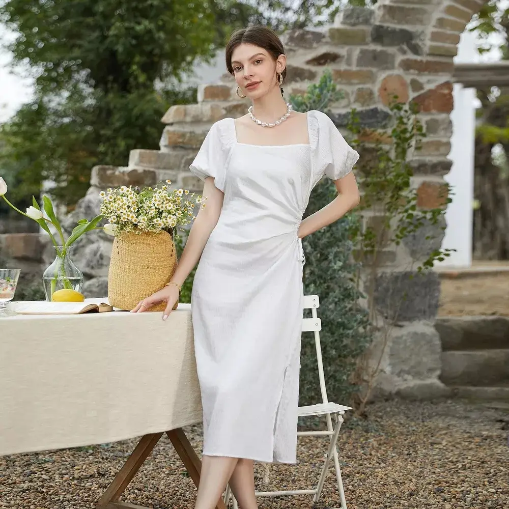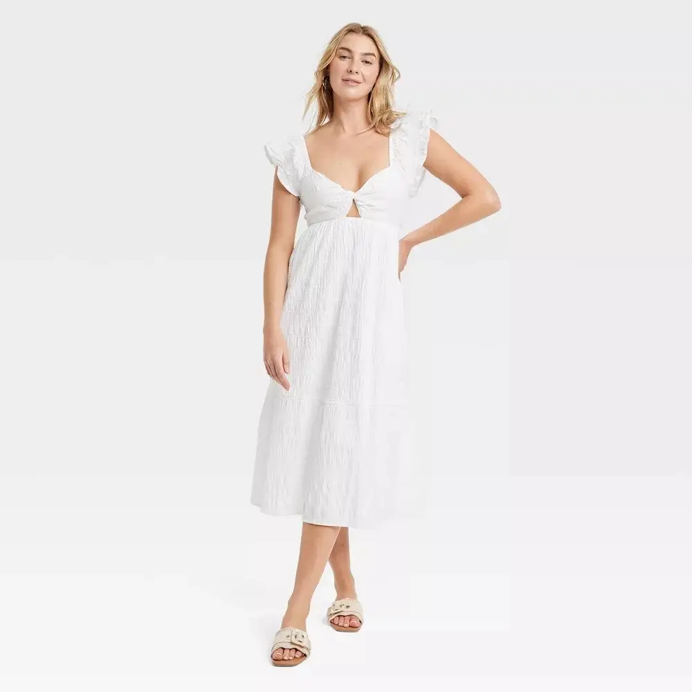 Ivory Puff Sleeve Cut-Out Midi Dress